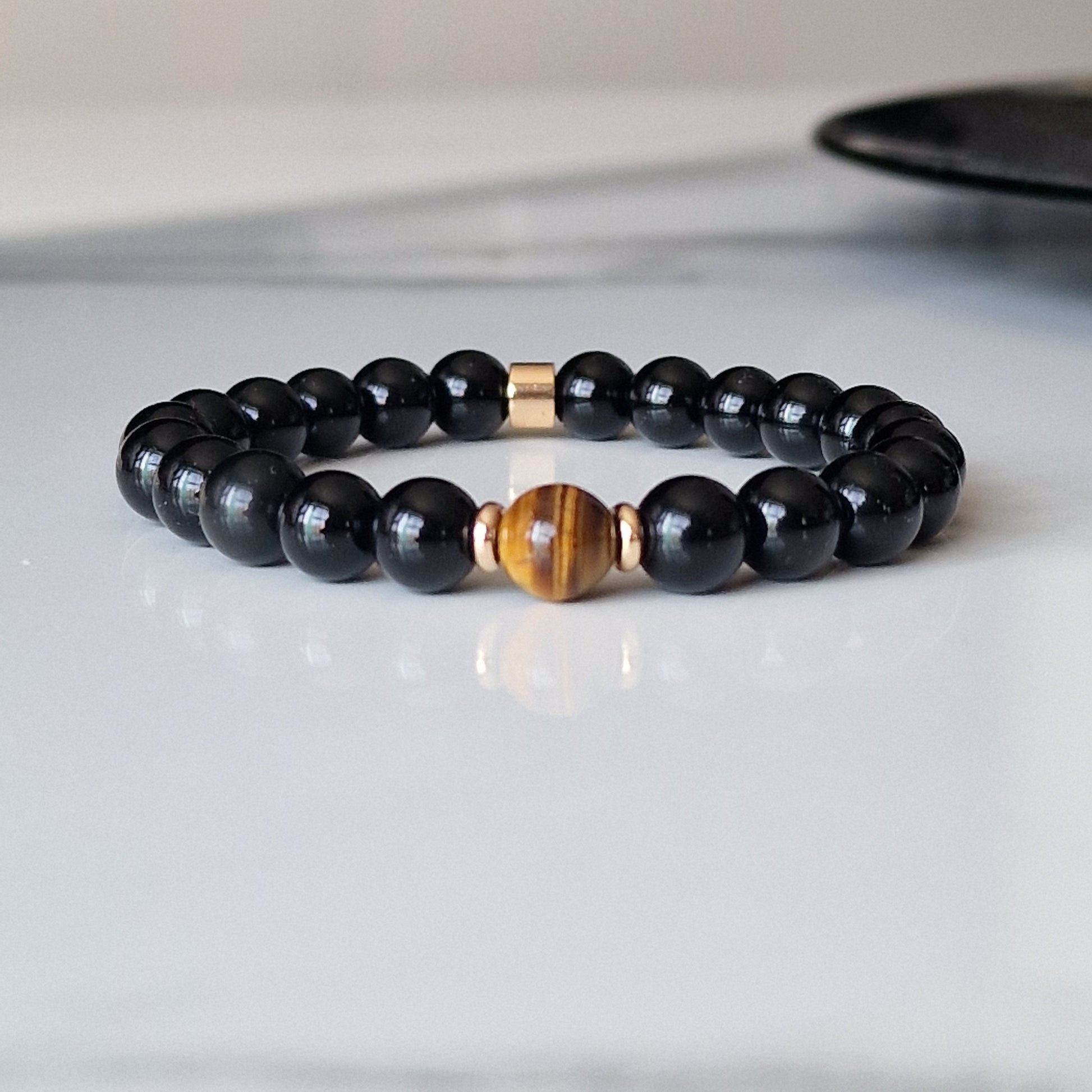 Enhance your style with our Black Onyx, Tiger Eye crystal bracelet. The 8mm beads feature stunning 18k gold plated accents for a touch of elegance. Perfect for any occasion, this bracelet adds a unique and sophisticated touch to any outfit.