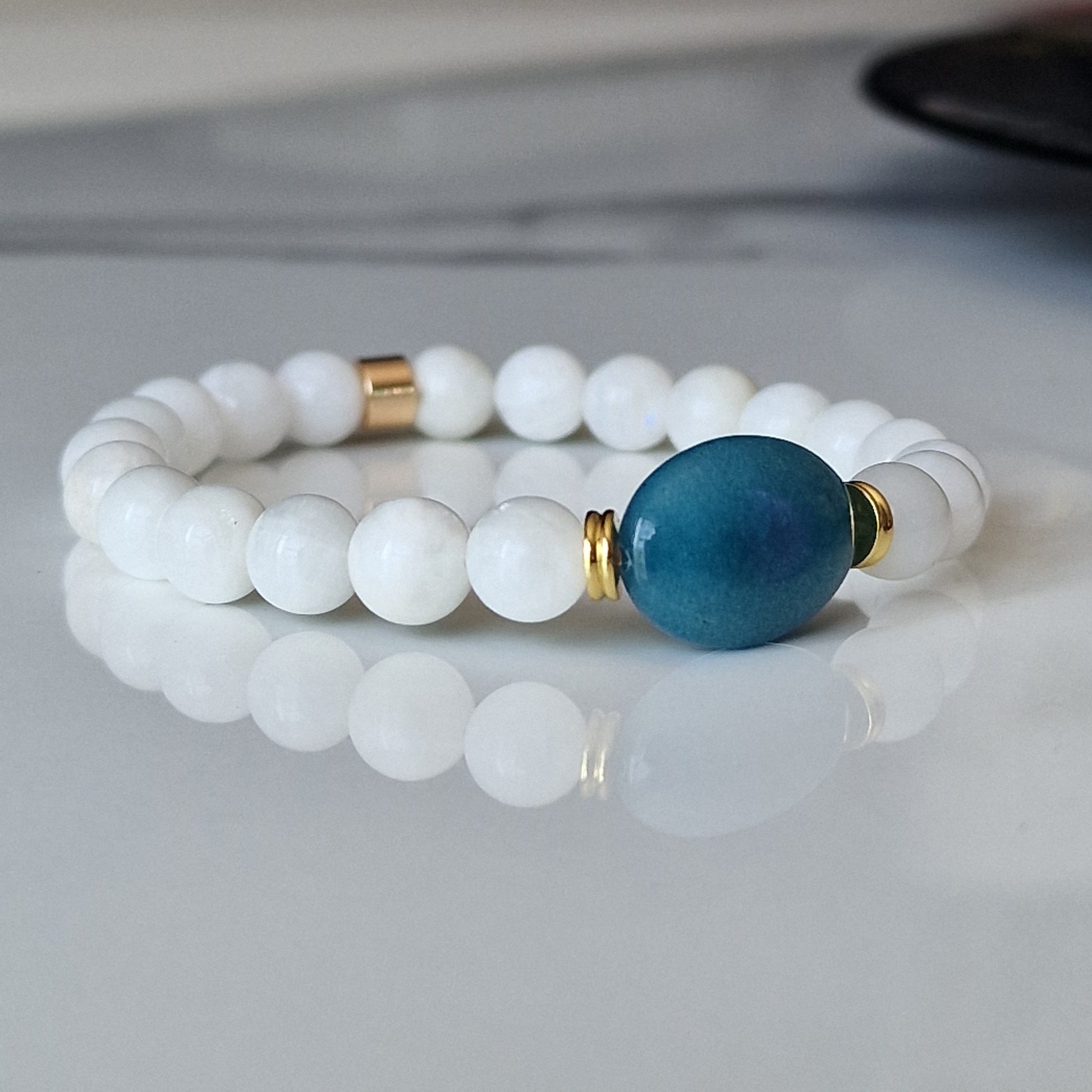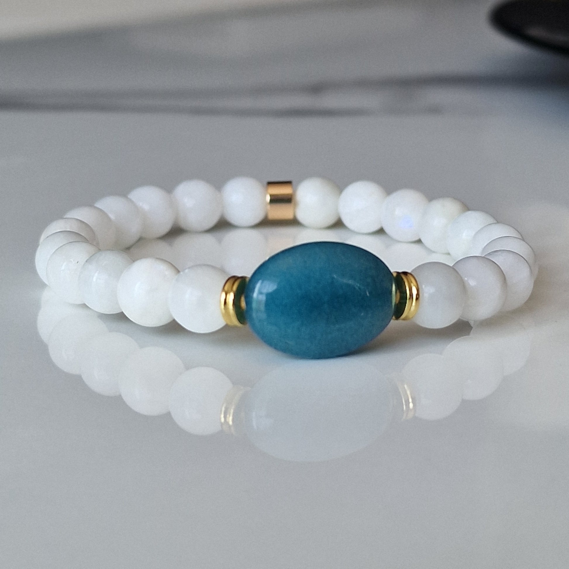Discover the beauty of the Genuine Moonstone Bracelet with Blue Agate. Crafted with 18k and 24k gold plated accents, this bracelet features 8mm genuine Moonstone beads and a blue oval Agate centerpiece. Add a touch of elegance to any ensemble or gift it to a friend for a thoughtful present.