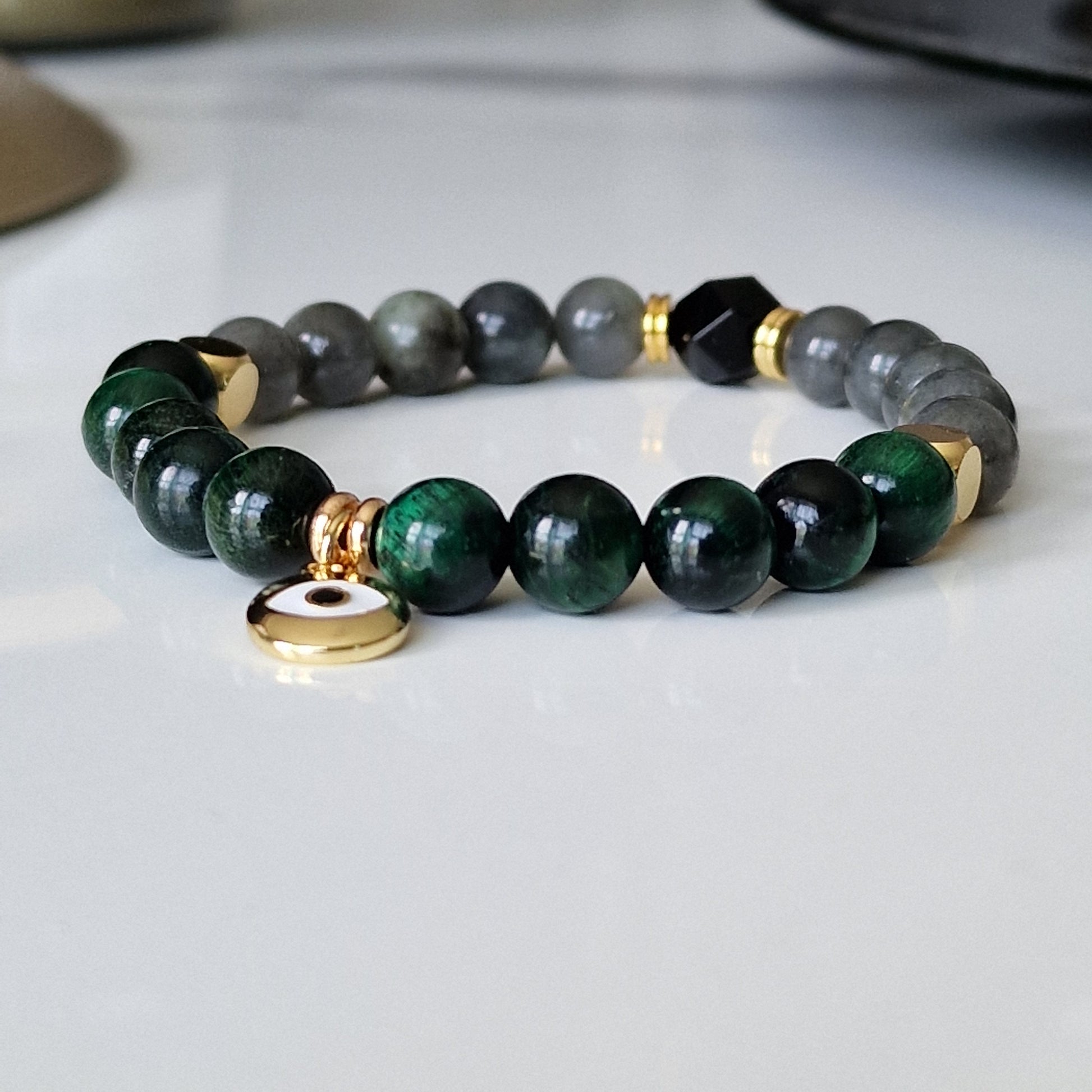 This beaded crystal bracelet features Labradorite, Green Tiger Eye, and Black Onyx, providing a combination of grounding, protective, and balancing energies. Stimulate self-awareness, enhance intuition, and promote inner strength with this versatile accessory. Perfect for everyday wear or special occasions.