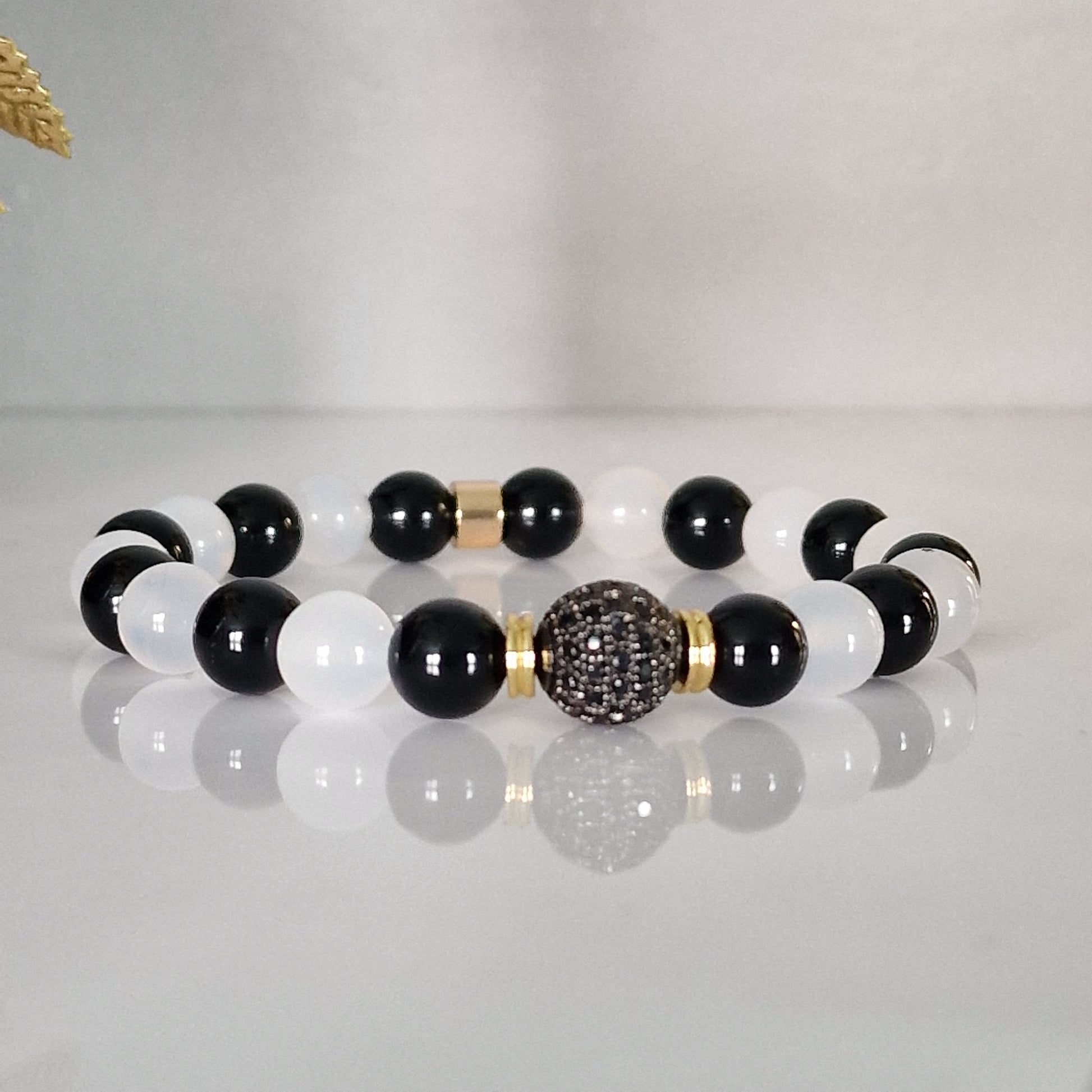 Elevate your style with our black Onyx and Agate crystal bracelet. This sophisticated 8mm beaded design combines the grounding properties of black onyx with the protective energy of agate, enhanced by luxurious 18ct and 24ct gold plated accents. A perfect gift for someone.