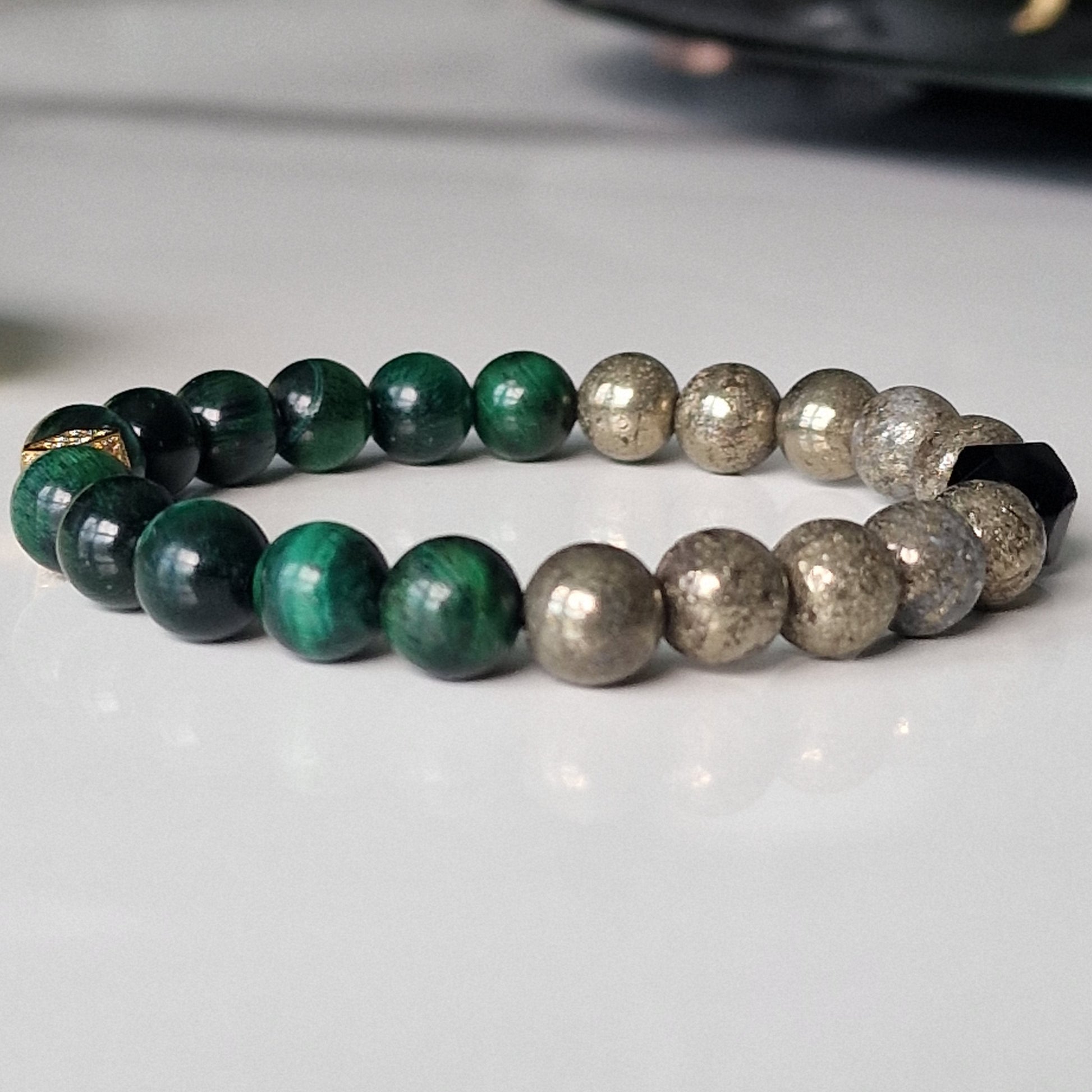This natural Tiger Eye and Pyrite crystal bracelet features 8mm beads, 10*9mm star cut Black Onyx with 18k, 24k gold plated accents for added shine and durability. The natural green tiger eye and pyrite crystals offer protection and grounding, making this bracelet both stylish and beneficial for your well-being.